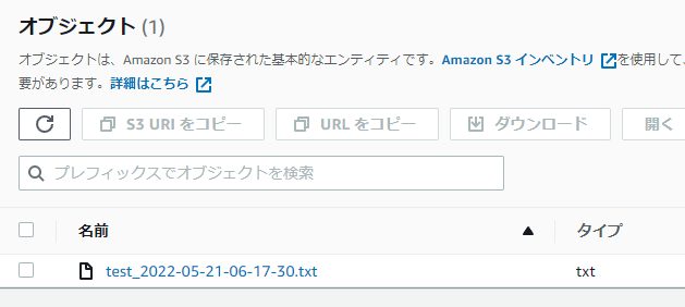 Lambdaからテストすると、S3にファイルが作成されていました。